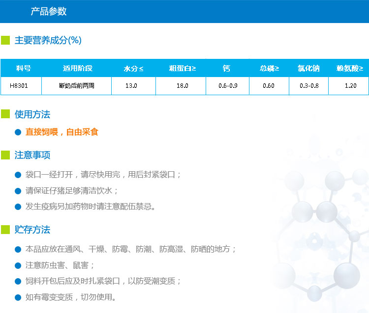 格立宝“H8301”是由浙江格立宝饲料科技有限公司运用国际的乳猪营养科研成果,根据乳猪的生理特点和营养需要,并结合现在乳猪教槽科与普通保育料过渡难造成二次应激的实际情况,本店优选原料,使用先进的超微粉碎生产设备和加工工艺而开发的新一代乳猪保育配合饲料。